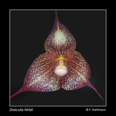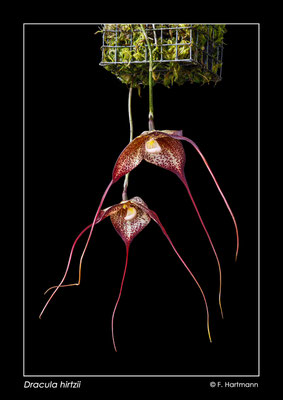 Die Blüten werden an relativ langen, hängenden Blütenstengeln gebildet, die sich nach unten durch das Substrat ans Licht schieben. Kultiviert man Draculas nicht aufgebunden, müssen sie in Gittertöpfe oder Drahtkörbchen gepflanzt werden, ansonsten bleiben die Blüten im Pflanzstoff stecken. Die Blütengrößen der verschiedenen Arten sind sehr unterschiedlich. Sie können nur 0,5 cm, aber auch wie das vorgestellte Dracula hirtzii dank der fadenförmigen Sepalen 25 cm erreichen. Es wächst in Ecuador und Kolumbien, in Höhen von 1300 bis 2600 m.